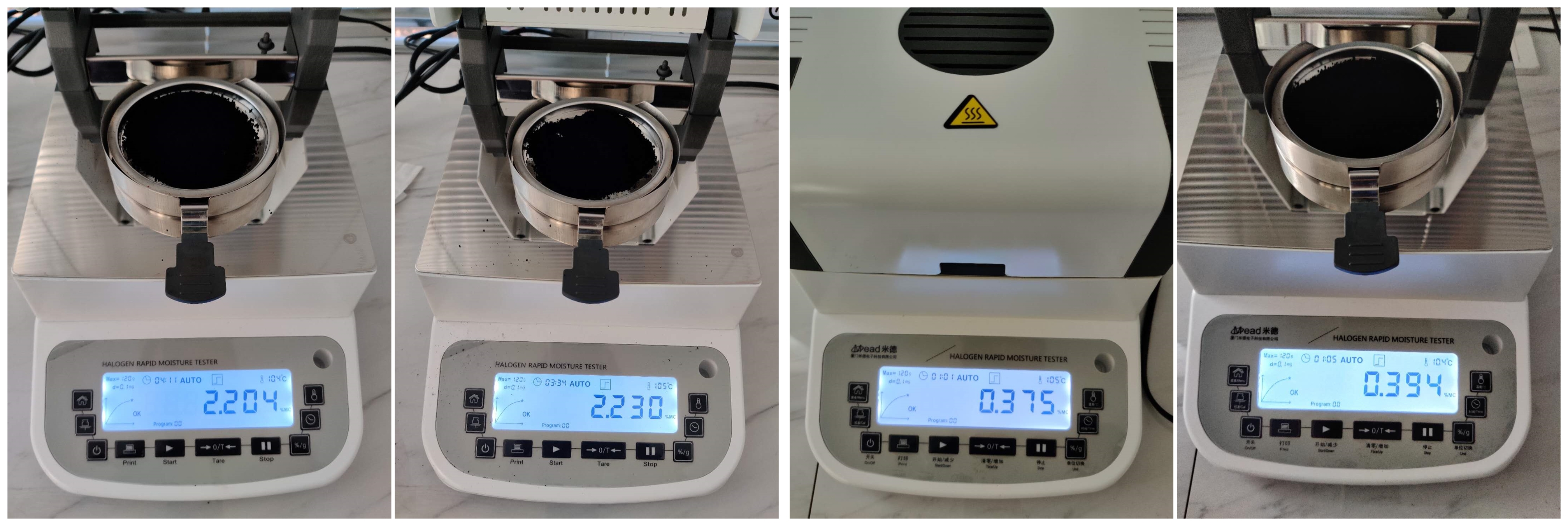 - 用樣品勺取適量充分暴露在空氣中的碳黑粉末均勻鋪在樣品盤上,設置好合適的溫度后蓋下上蓋,按下“START”鍵開始測試;蜂鳴兩聲后,儀器自動停機,測試結束,可在液晶顯示屏查看被測粉體的水分含量為2.204%;