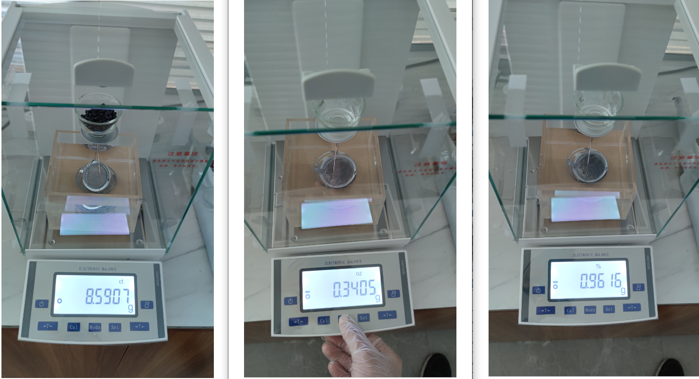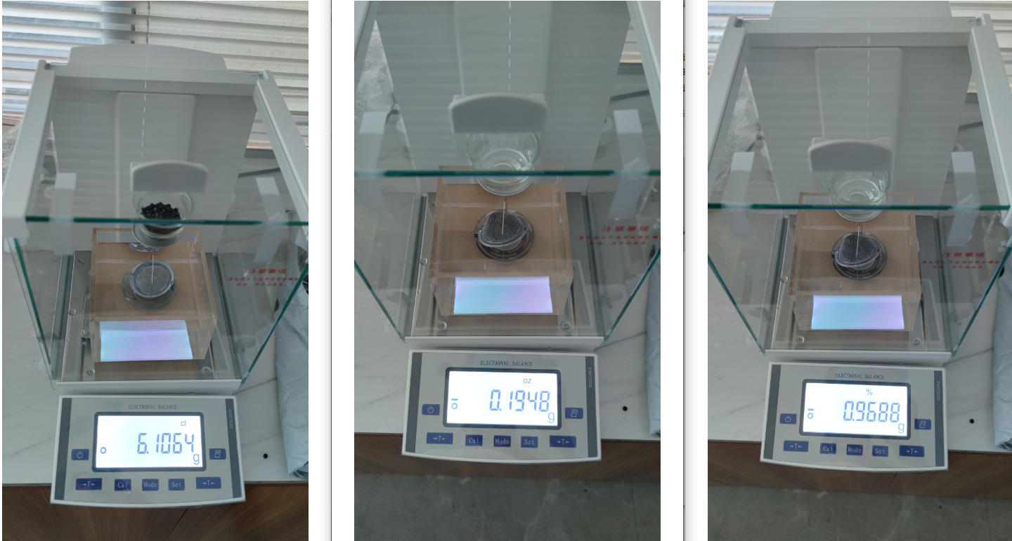 - 把水槽中的網球取出擦干,打開并倒入玻璃杯中的塑料顆粒,合上網球,為避免塑料顆粒在放入水中時產生氣泡影響最終結果,用酒精浸潤網球和里面的塑料顆粒,瀝干后重新將網球放入水槽中的吊籃上,空玻璃杯也放回稱量臺上,待儀器穩定后按下Mode鍵,計量塑料顆粒在水中的重量為-0.3405g,儀器自動計算結果并顯示密度為0.9616g/cm?。