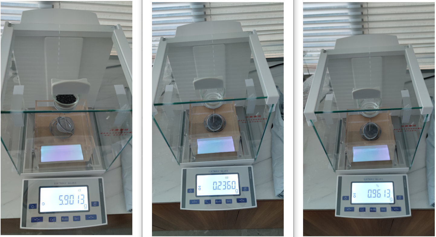 - 重復測試步驟,檢查密度計的重復性,第二次測試得出結果為9688g/cm?,第三次測試的結果為0.9613g/cm?,兩次重復測試的結果與第一次結果的最大誤差僅為0.075,重復性好。