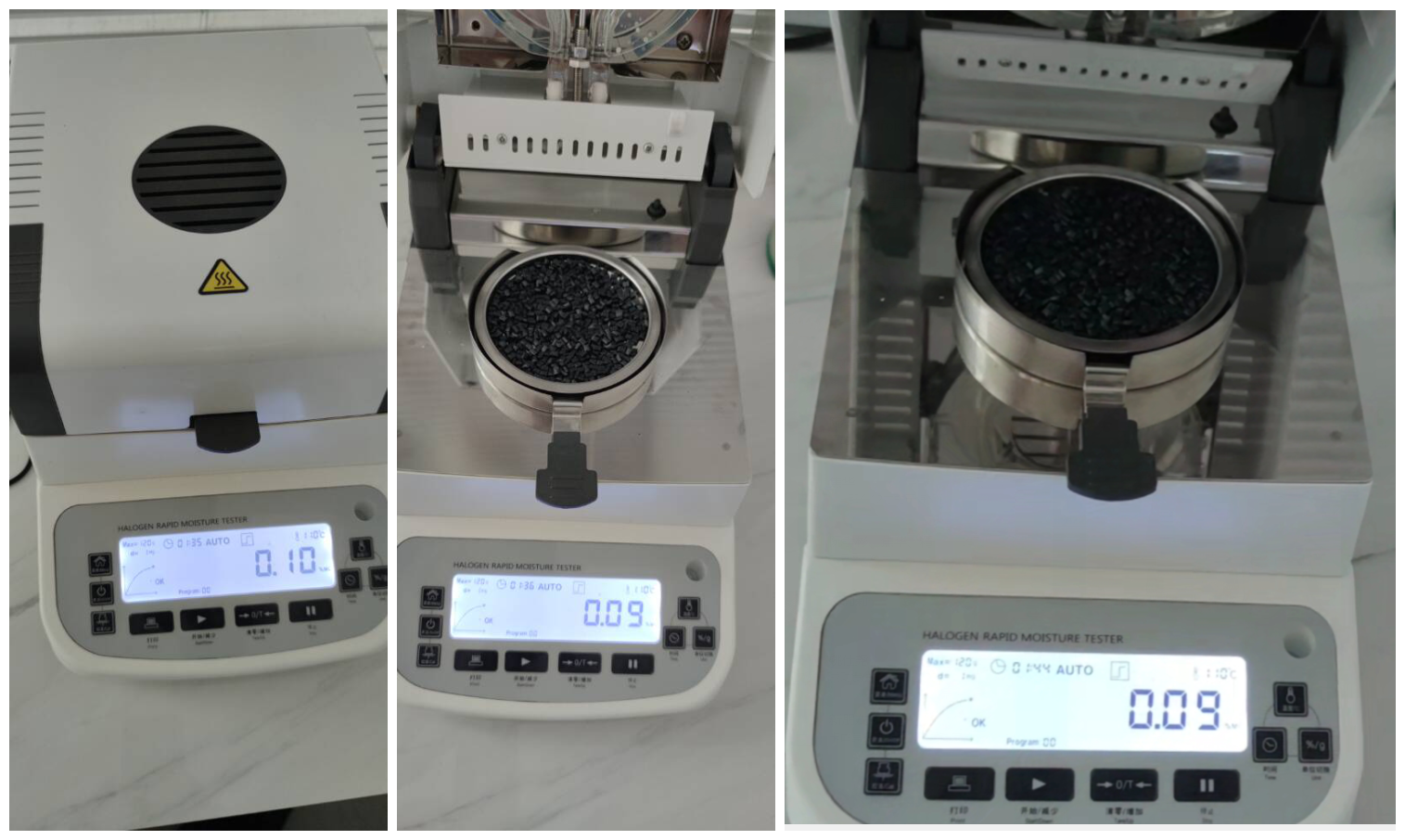 - 復(fù)位儀器,待儀器冷卻至40℃以下后,再取15g左右樣品鋪在樣品盤上,重復(fù)上述測試步驟;測試結(jié)束后得出第二組數(shù)據(jù),顯示樣品的水分含量為0.09%;數(shù)據(jù)基本相同誤差僅為0.01%,表示測試結(jié)果可靠,可重復(fù)性好。