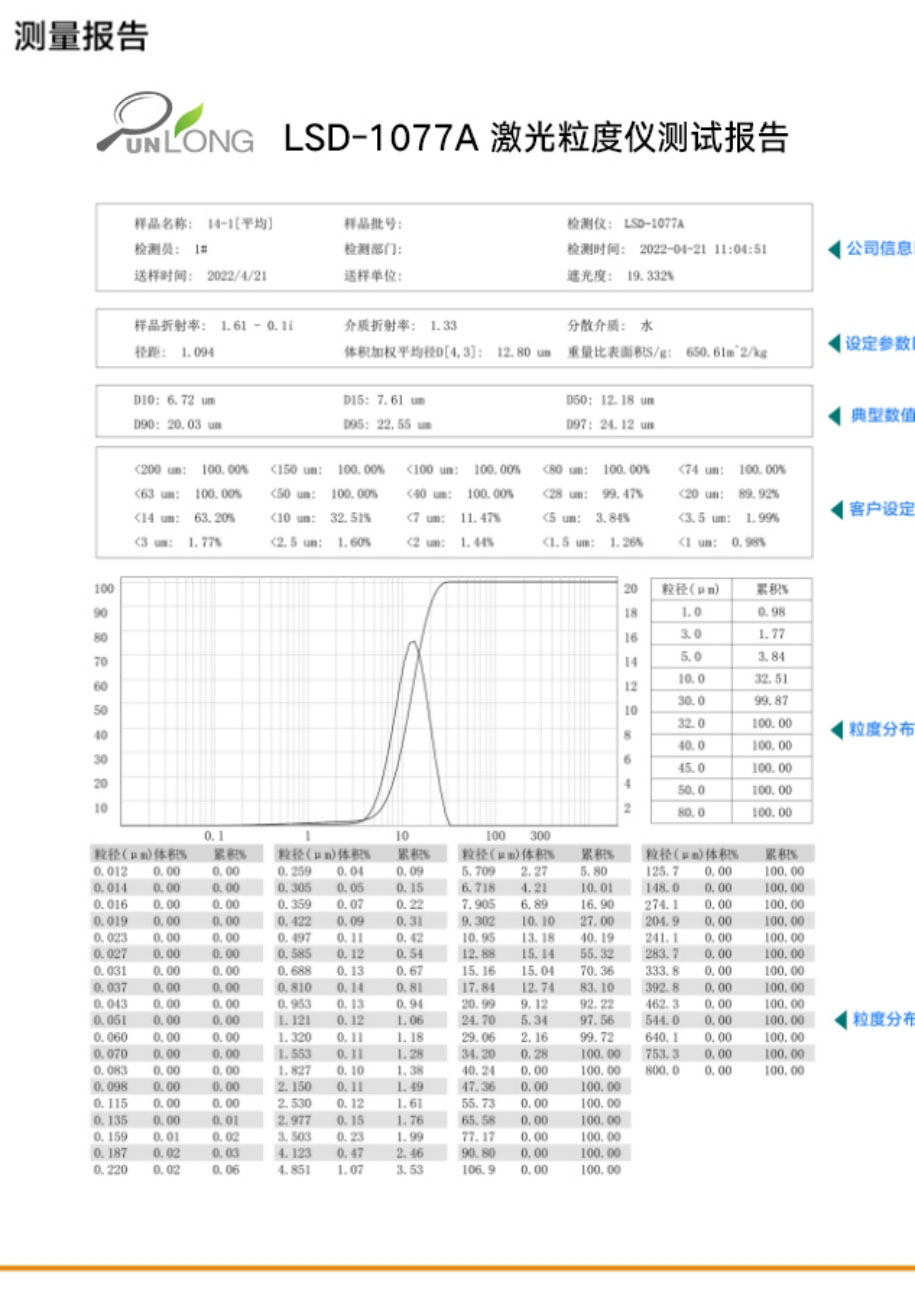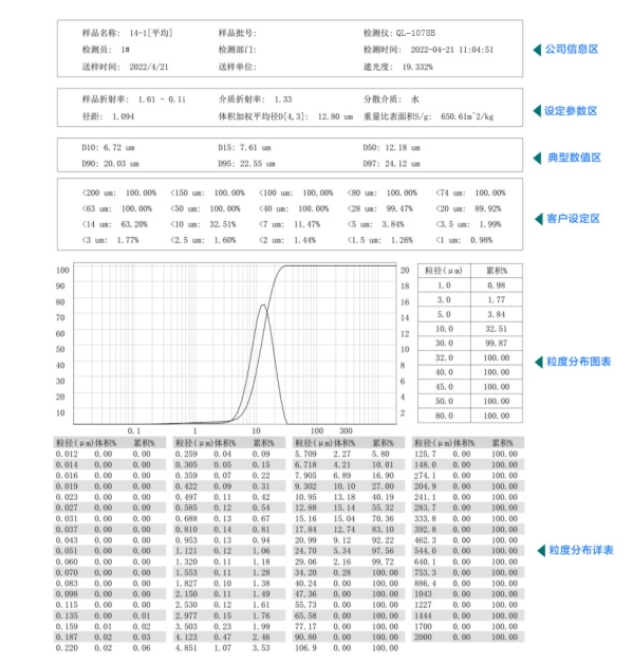 顯示模板 | 粒徑區間求百分比,以滿足不同行業對粒度測試的表征方式。徑距、一致性、區間累積等等 | |