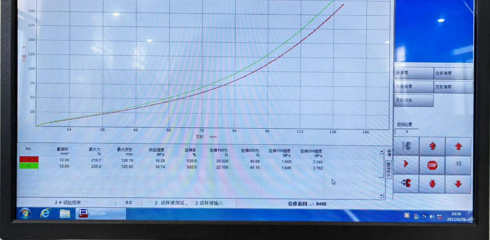 - 圖形曲線尺度自動化 Auto Scale,可使圖形以尺度顯示。并可于測試中實時圖形動態(tài)切換。具有荷重-位移、荷重-時間、位移-時間、應(yīng)力-應(yīng)變 荷重-2 點延伸圖,以及多曲線對比。